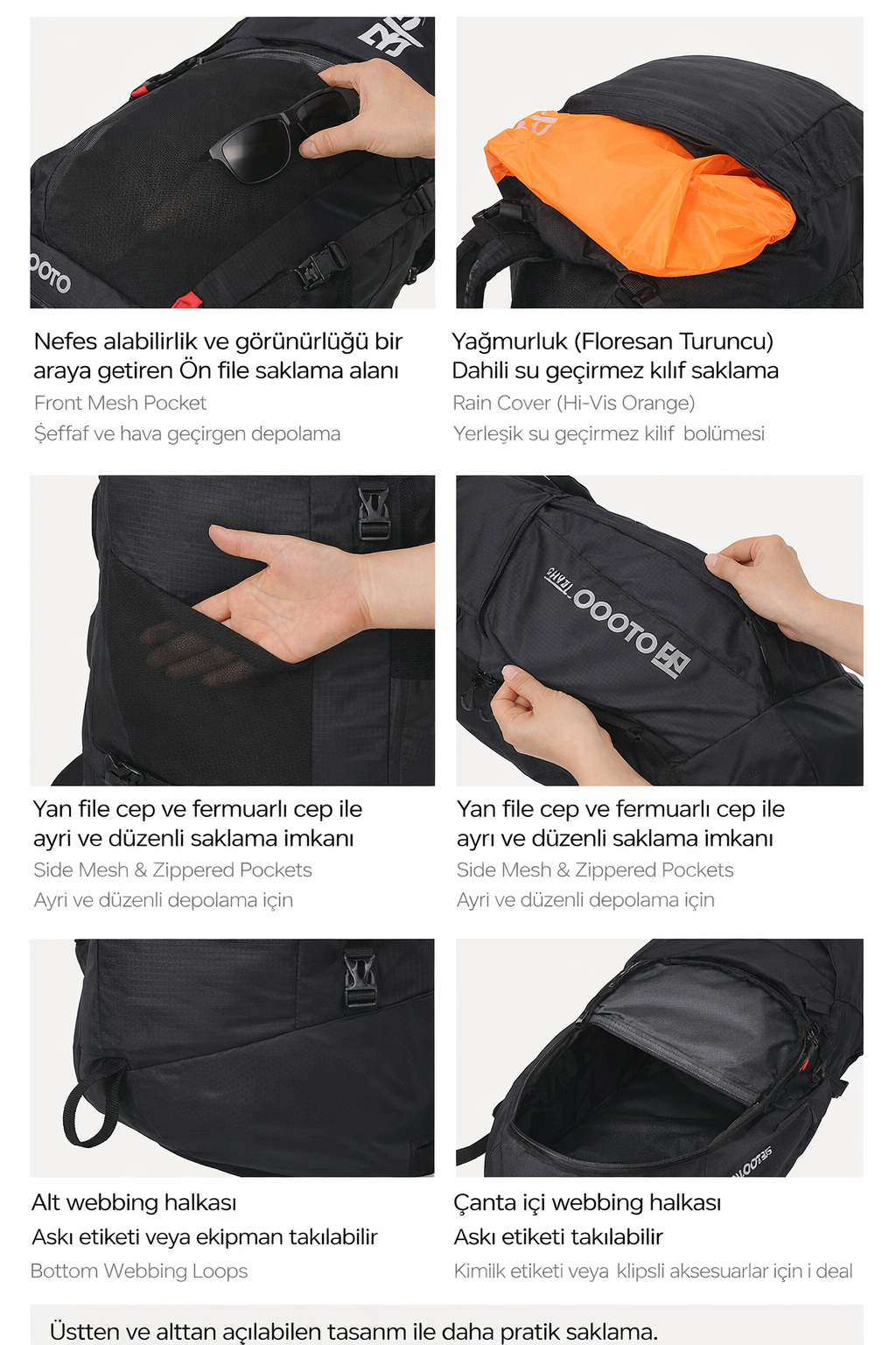 Çantanın iç ve alt kısmında bulunan halkalar sayesinde kimlik etiketi veya ekipmanlarınızı kolayca sabitleyebilirsiniz.