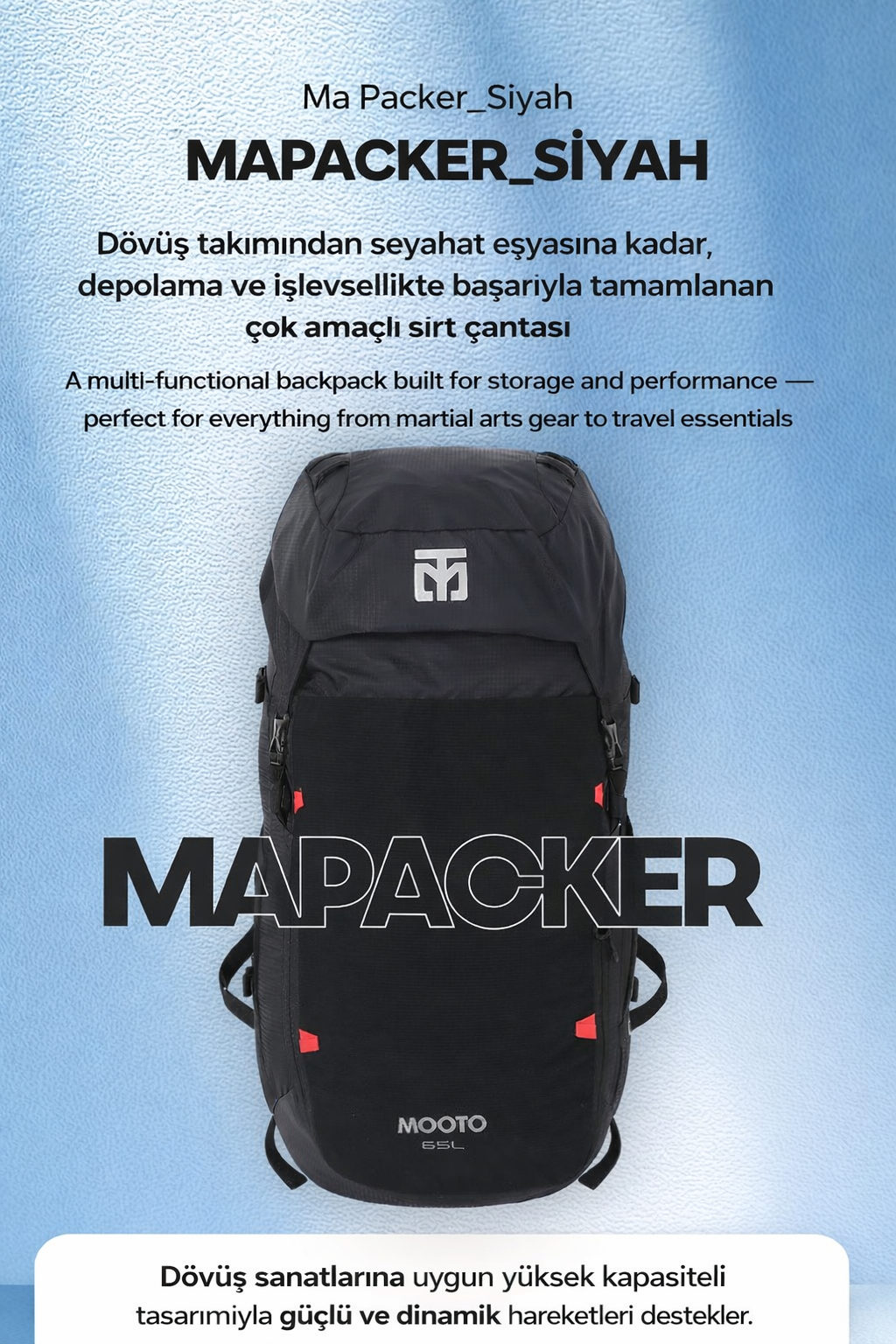 Antrenman, seyahat ve günlük kullanım için tasarlanan Mooto Ma Packer Spor Çanta 65L, geniş iç hacmi ve akıllı depolama alanlarıyla sporcular için ideal bir çantadır. Dayanıklı yapısı ve fonksiyonel tasarımı sayesinde ekipmanlarınızı düzenli ve güvenli şekilde taşımanıza yardımcı olur.