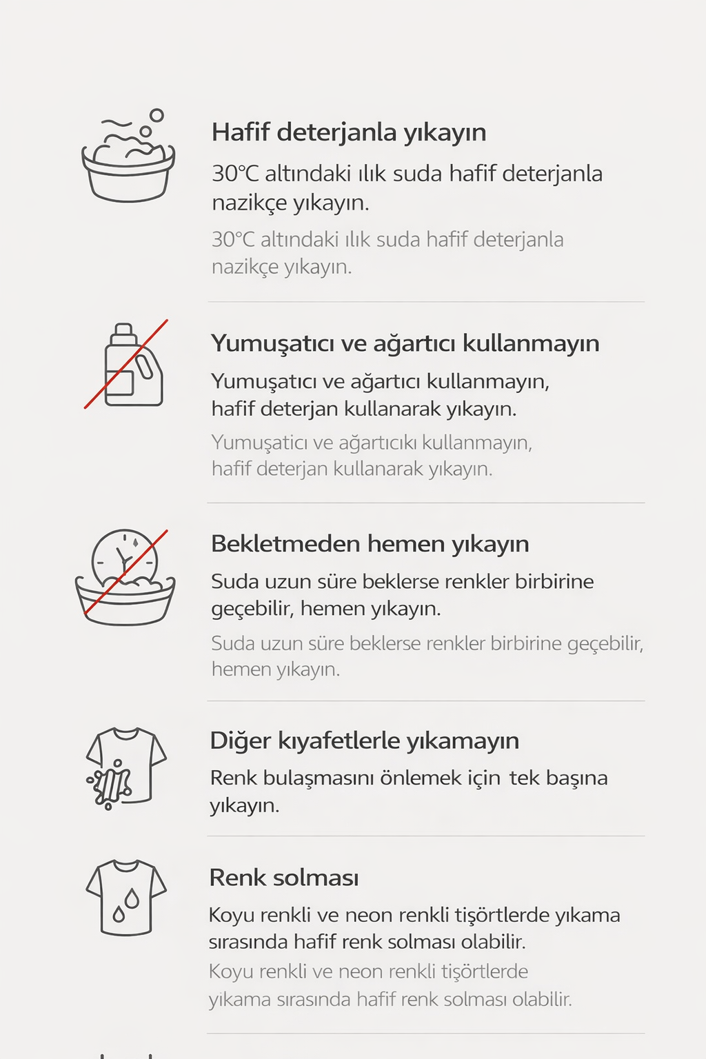 Not: Koyu ve neon renklerde yıkama sırasında hafif renk solması oluşabilir.