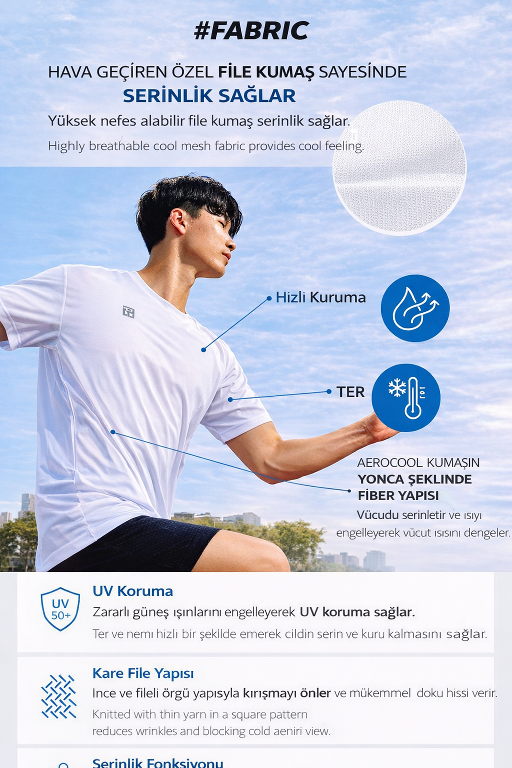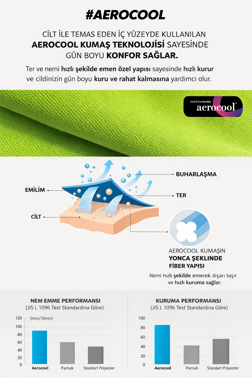 Aerocool kumaş, cilt ile temas eden iç yüzeyde yüksek nem emme ve hızlı kuruma sağlayan özel lif yapısına sahiptir. Yonca şeklindeki fiber yapısı sayesinde teri hızla emerek dış yüzeye aktarır ve buharlaşmasını sağlar. Böylece spor sırasında vücudun serin ve kuru kalmasına yardımcı olur.